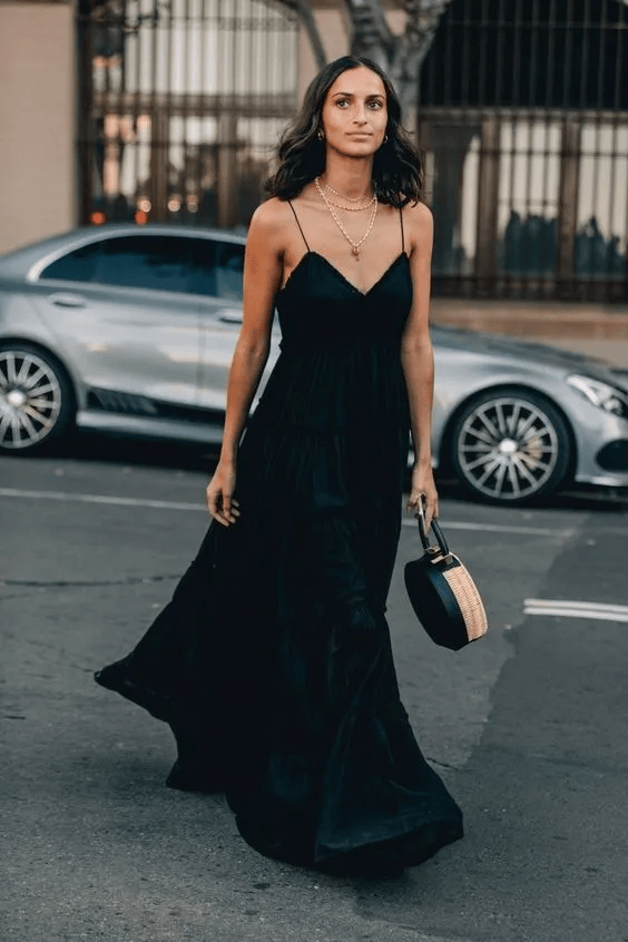 黑色吊带连衣裙,给人优雅挺拔的支撑感,带来别样的气质氛围,散发出自由不羁的气度,让人自在地展现魅力,打破了传统穿搭的束缚,又展现出了一种随性自在的时尚态度