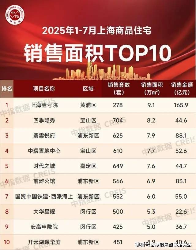 2025年1-7月,上海商品住宅销售金额TOP10项目合计销售777.4亿元。本次TOP10门槛值为47.7亿元。其中,第一名上海壹号院销售金额为165.9亿元,第二名金陵华庭92.1亿元、第三名翡雲悦府88.1亿元。