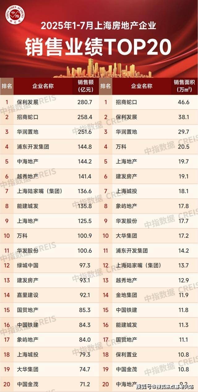2025年1-7月,上海房地产销售业绩TOP20企业合计销售2581.8亿元;销售面积TOP20企业合计销售362.2万平。销售额突破百亿元的房企有11家,其中保利发展、招商蛇口、华润置地分别以280.7亿元、258.4亿元和251.6亿元获得销售金额榜前三名;销售面积榜达到15万平以上的房企有10家,招商蛇口、保利发展、华润置地分别以46.6万平、38.1万平和29.7万平获得前三名。
